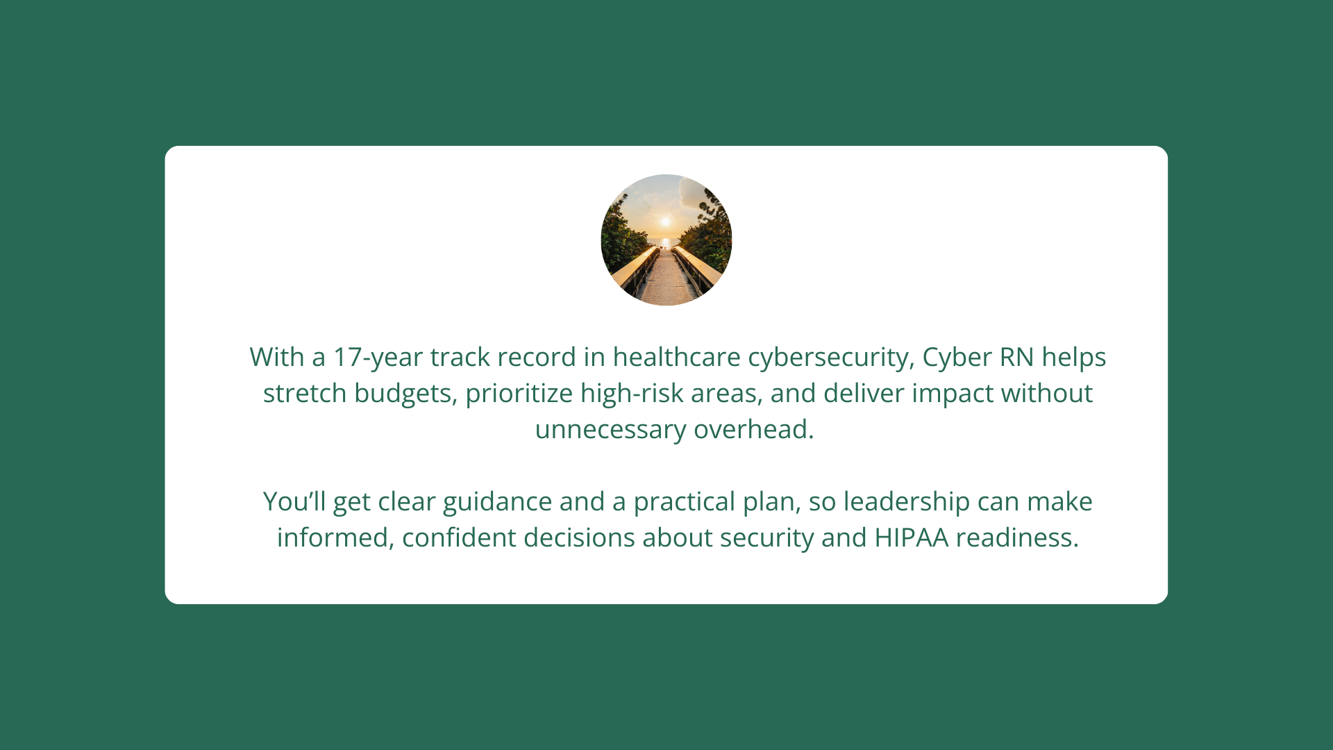 CyberRN will conduct an assessment, identify risks, develop action plan, deliver report and provide ongoing support if desired